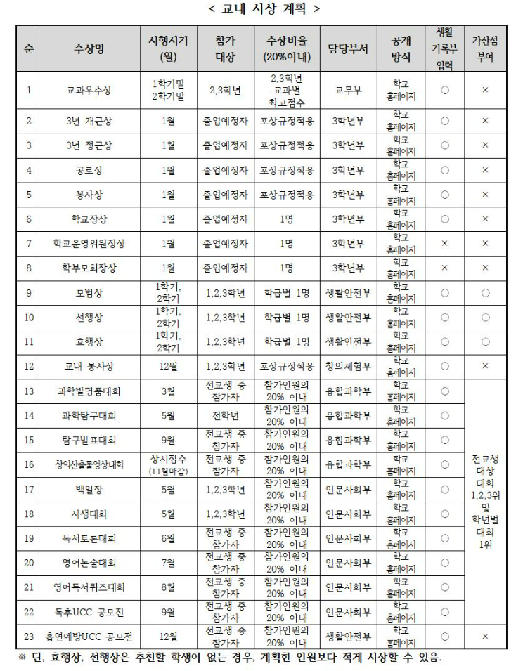 시행월과 참가대상을 살펴보고 수상 비율을 알 수 있고, 생활기록부에 입력 가능한지를 알아보면 고등학교에 진학하기 위해 어떤 준비를 해야 할지 알 수 있습니다. 시상계획이 있다는 것은 활동이 많다는 것이고 그렇다는 얘기는 세부능력 특기사항에 기록될 내용이 풍성해 진다는 것이기 때문에 활동이 다채로운 중학교 생활에서 즐거움도 찾고 고등학교 진학때에도 풍성한 생기부 기록을 얻을 수 있다는 이야기이죠.